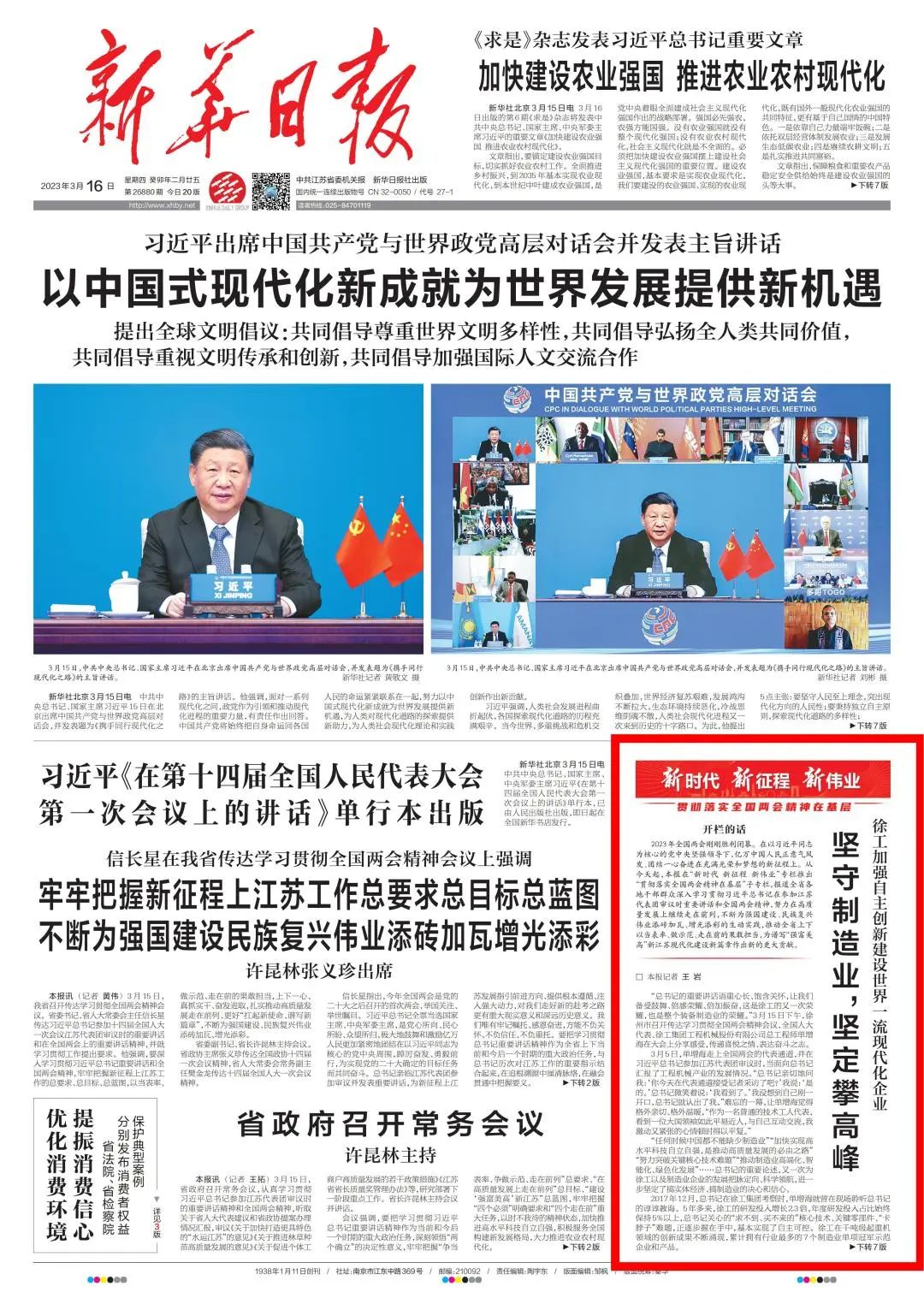 今天,,,,《新华日报》在“新时代 新征程 新伟业”专栏推出“贯彻落实天下两会精神在下层”子专栏,,,,报道全省各地干部群众深入学习贯彻习近平总书记在加入江苏代表团审议时主要讲话和天下两会精神,,,,起劲在高质量生长上继续走在前线,,,,一直为强国建设、民族再起伟业添砖加瓦、增光添彩的生动实践,,,,推动全省上下以当楷模、做树模、走在前的果敢继续,,,,为谱写“强富美高”新江苏现代化建设新篇章作出新的更大孝顺。。