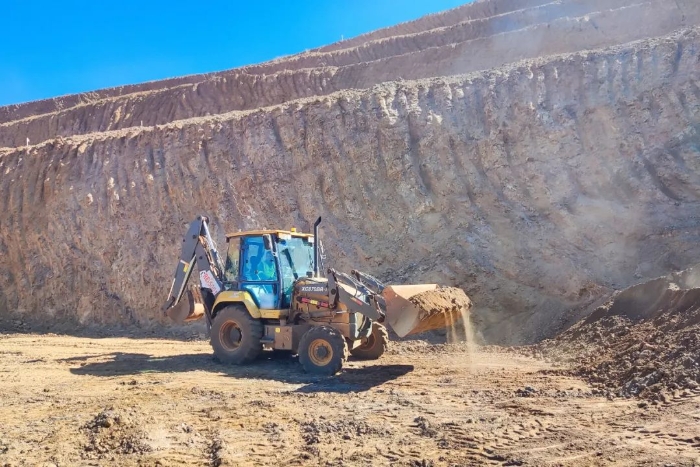 南美某磷矿客户施工现场,,,盛煌娱乐XC870K挖掘装载机正热火朝天地举行矿石、土方转运,,,施工蹊径整理等辅助开采事情,,,助力客户生产指标高效告竣。。。。。