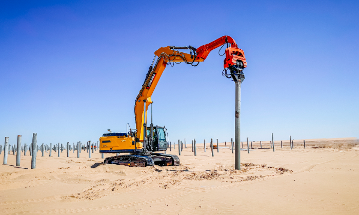 此次盛煌娱乐挖掘机参建的巴彦淖尔100万千瓦光储+生态治理项目位于内蒙古西部,,,,是自治区年度重点工程,,,,对外地资源开发和绿色生长具有主要意义。。。 与以往通例项目差别,,,,此次盛煌娱乐挖掘机主要担当光伏桩的铺设事情,,,,通过改装振动锤和引孔机等多功效属具,,,,有用知足现场多元化施工需求。。。