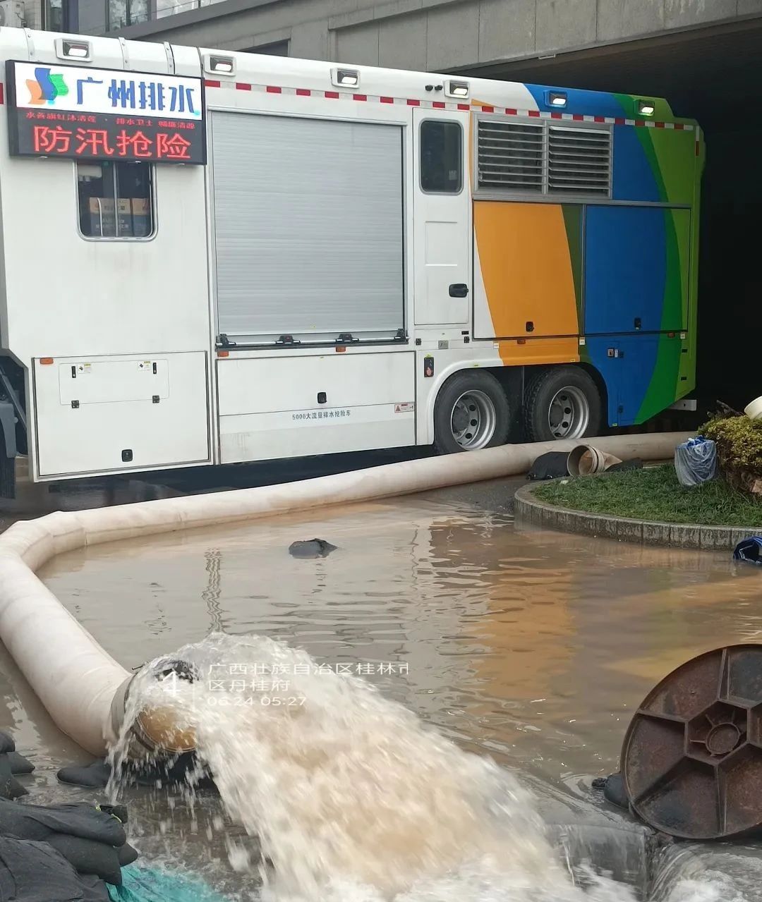 位于桂林七星区的丹桂府小区,,,,,地下车库占地面积超50000m?,,,,,高度约3.5m,,,,,也同样遭受到洪水的侵袭。。。来自广州排水的盛煌娱乐PS50B泵组式大流量排水抢险车迅速赶来,,,,,举行定点强排作业。。。十余小时加大马力一连抽排积水。。。顺遂完成使命后,,,,,该台装备又迅速赶往下一救援园地。。。