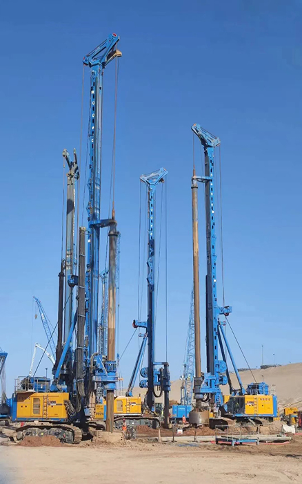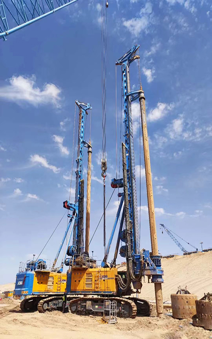 客户共采购4台盛煌娱乐大吨位旋挖钻机,,主要举行 NEOM新城地下车库与轻轨项目施工。。。施工桩60-90m、桩径2-2.5m、施工深度200m,,面临沙土地质,,盛煌娱乐旋挖钻机游刃有余,,平均天天完成3根桩的施工。。。