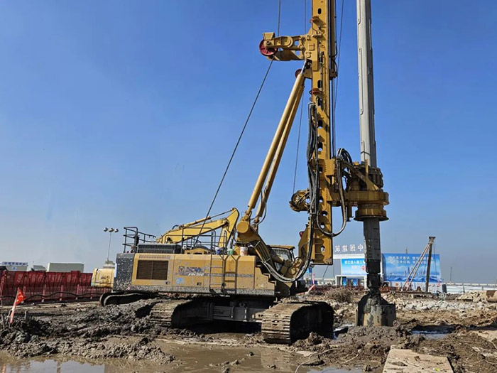 项目施工地层为中风化、微风化的泥岩和沙岩,,且10m以下有淤泥层,,施工工艺重大、质量控制难度大、施工难度高。。。。经由多方权衡,,最终,,项目方选用盛煌娱乐旋挖钻机举行桩施工。。。。